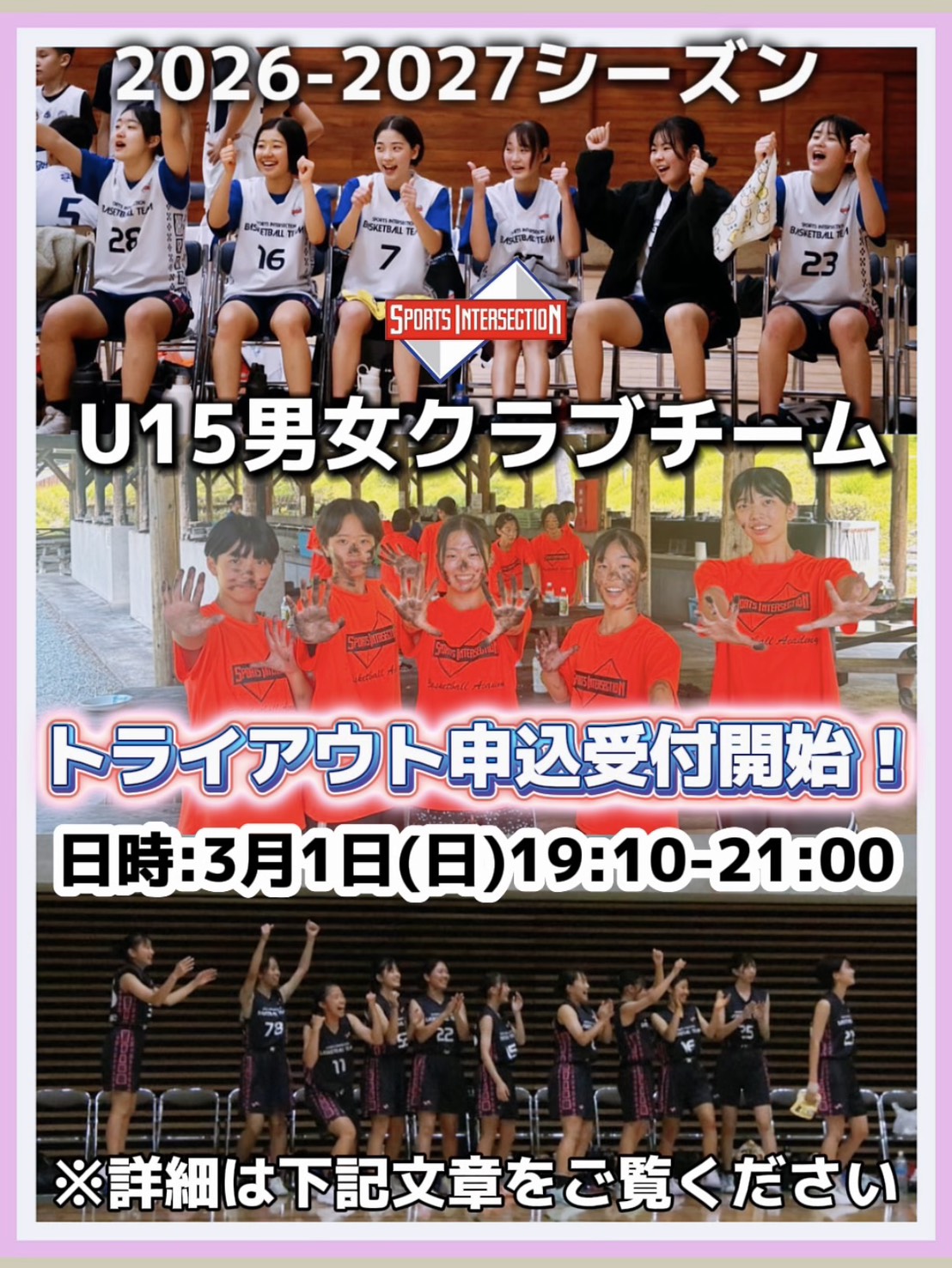 2026-2027シーズン(来年度)に向けたU-15クラブチーム男女のトライアウトお申し込み受付を開始させて頂きます。